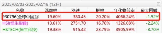 2月以来,中概股表现持续强势,中概互联ETF(513220)标的指数12个交易日中累计涨幅达19.60%,阶段涨幅和最大回撤均优于恒生指数、恒生科技指数。
