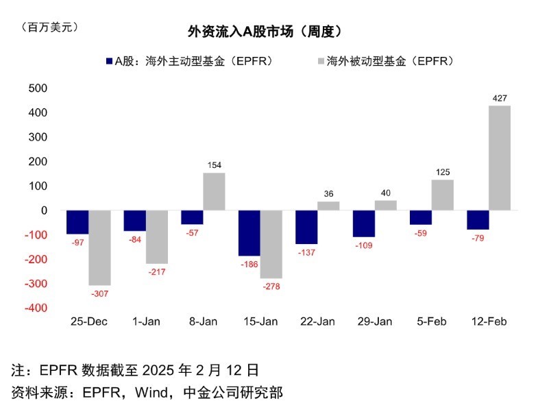 根据中金公司研报数据,2月6日—2月12日,A股被动资金流入4.3亿美元,前一周被动资金流入为1.3亿美元。同期,港股和ADR海外资金整体流入2.8亿美元,其中被动资金流入从前一周的2.5亿美元增至5.4亿美元,实现翻倍。该机构指出,海外对冲基金等交易型资金流入中国市场,甚至可能是阶段性的主力;海外被动ETF资金流入明显加速。